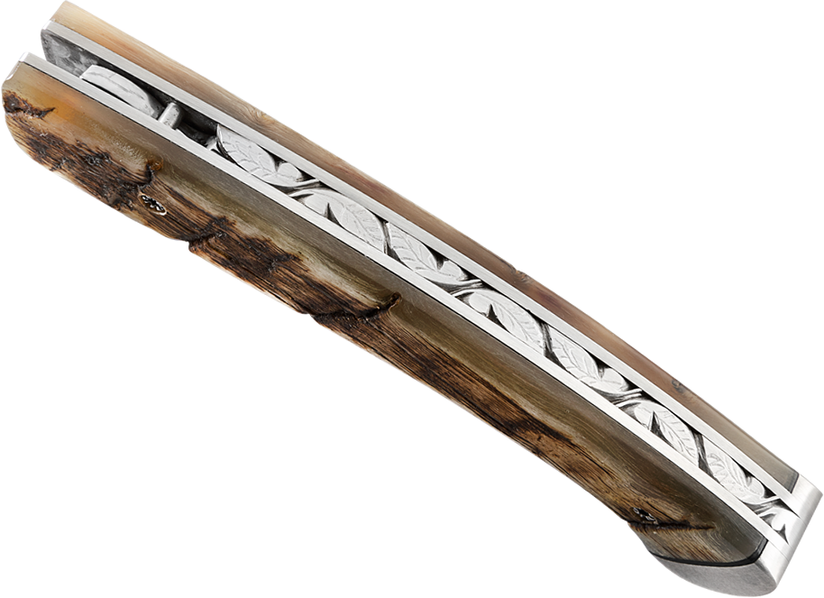NEU Atelier 1515 - Sammlermesser Mufflon Klappmesser mit Heckabschluss Wunderschöne Handarbeit. Griff mit einem alten Mufflonhorn in "Feuer-Farben". Perfekt zentrierte Klinge mit präzieser Mechanik. Handgraviert. Klinge: INOX 14C28N Aussehen / Klingenende: Satin mit Gegenkante Griff: Mufflon HOrnPolster: Rückseite aus satiniertem Edelstahl Abstandhalter: Handgemeißeltes, rustikales Blatt Schraube: Blumen Teller: Verkorkt Klingengröße: 10 cm Schließsystem: Liner Lock Atelier1515 - Film https://vimeo.com/44918158