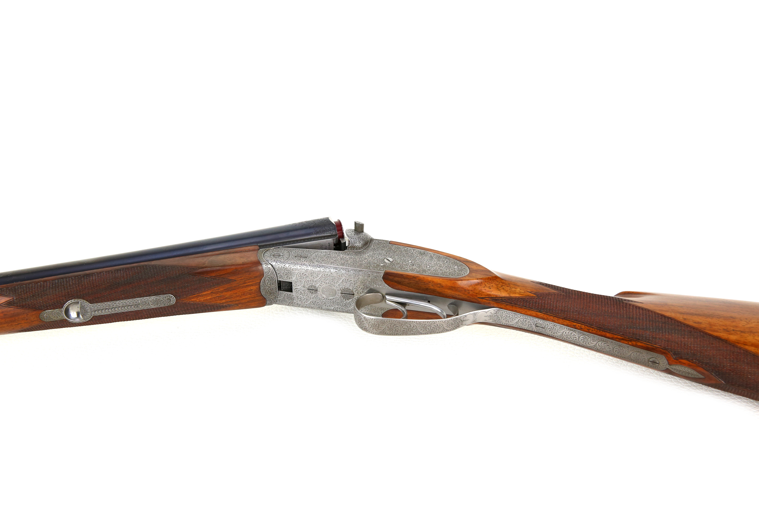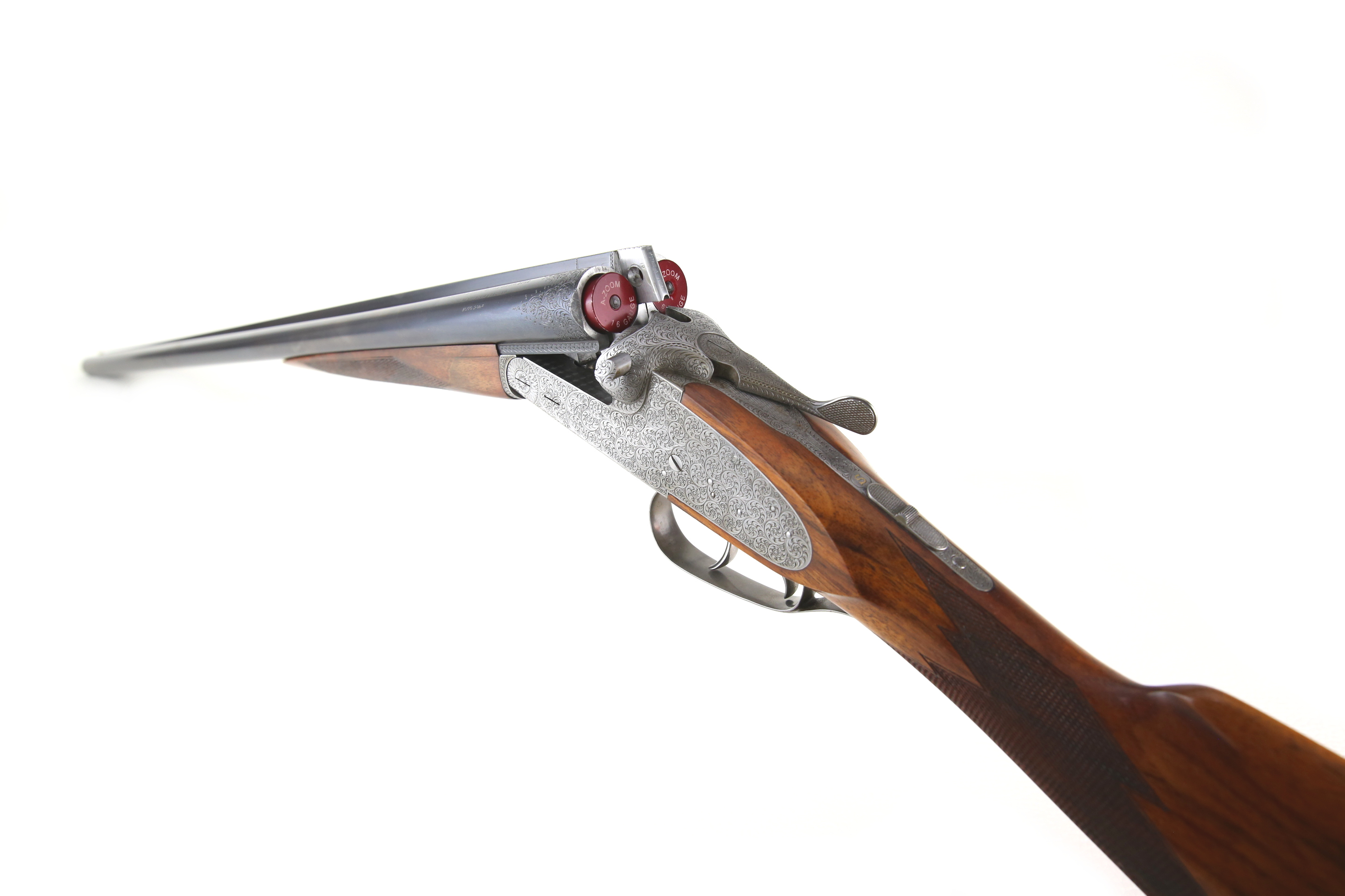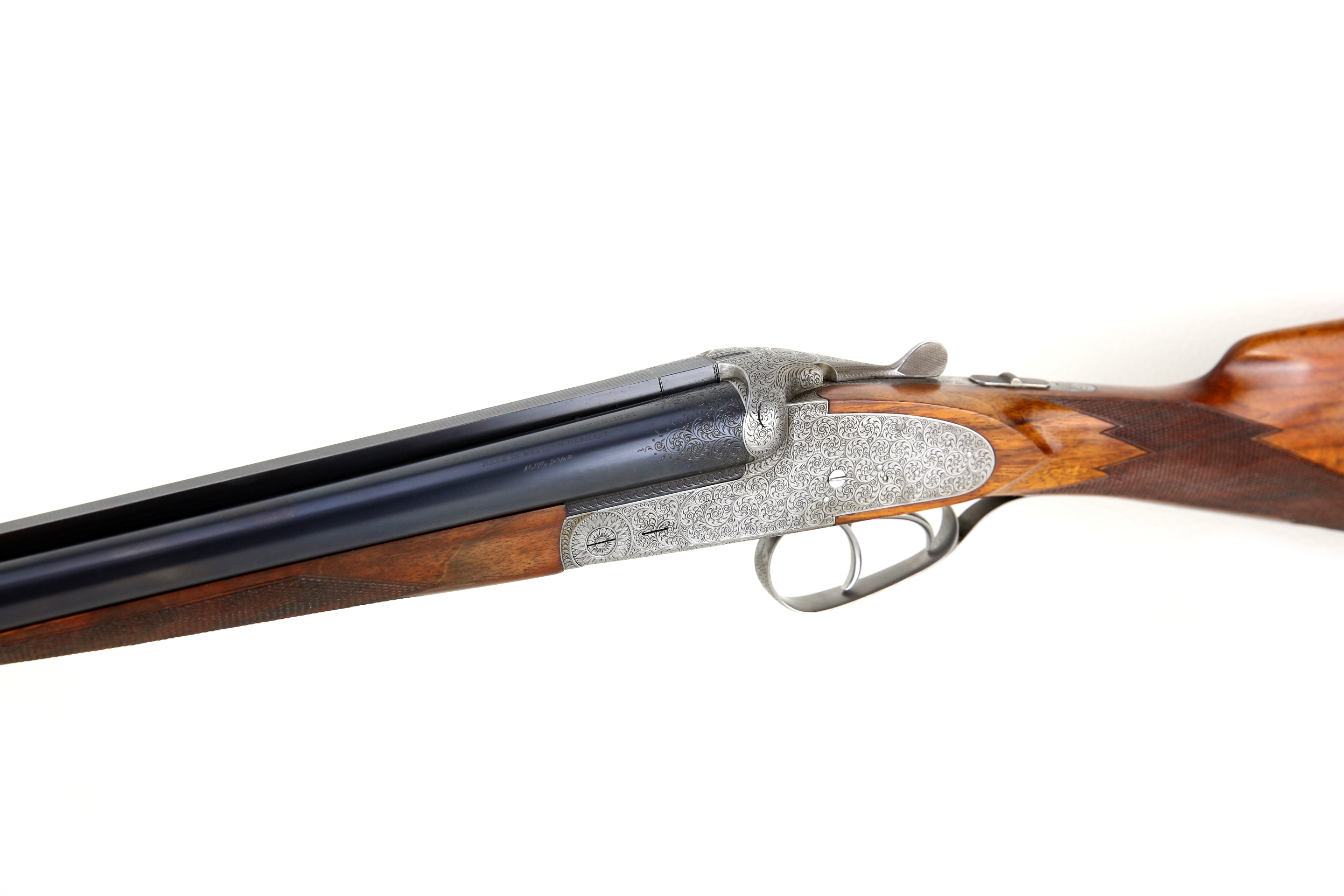 Wunderschönes Sammlerstück in neuwertigem original Zustand! Doppelflinte Sauer & Sohn 16/70 Seitenschloss. Herstellungsjahr: 1968. Aufwändige und feine Gravur von englischen Arabesken über das gesammte System, Seitenplatten, Laufwurzeln und Abzugbügel. Fein feschnittene Fischhaut an Kolbenhals unterseite und Schaftabschluss. Versenkte und gravierte Klapphebelschraube zum einfachen zerlegen der Seitenschlosse. Zustand: neuwertig.